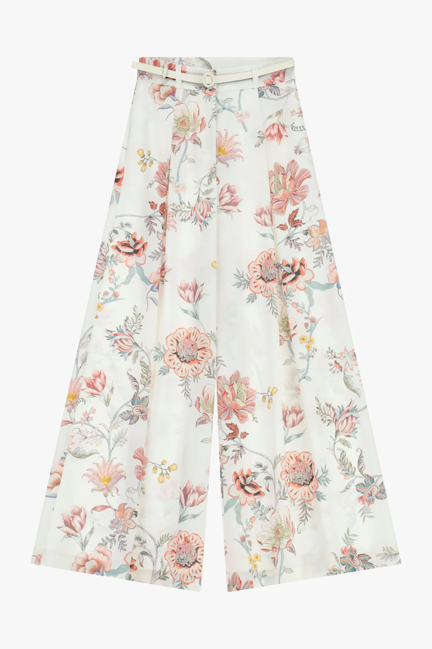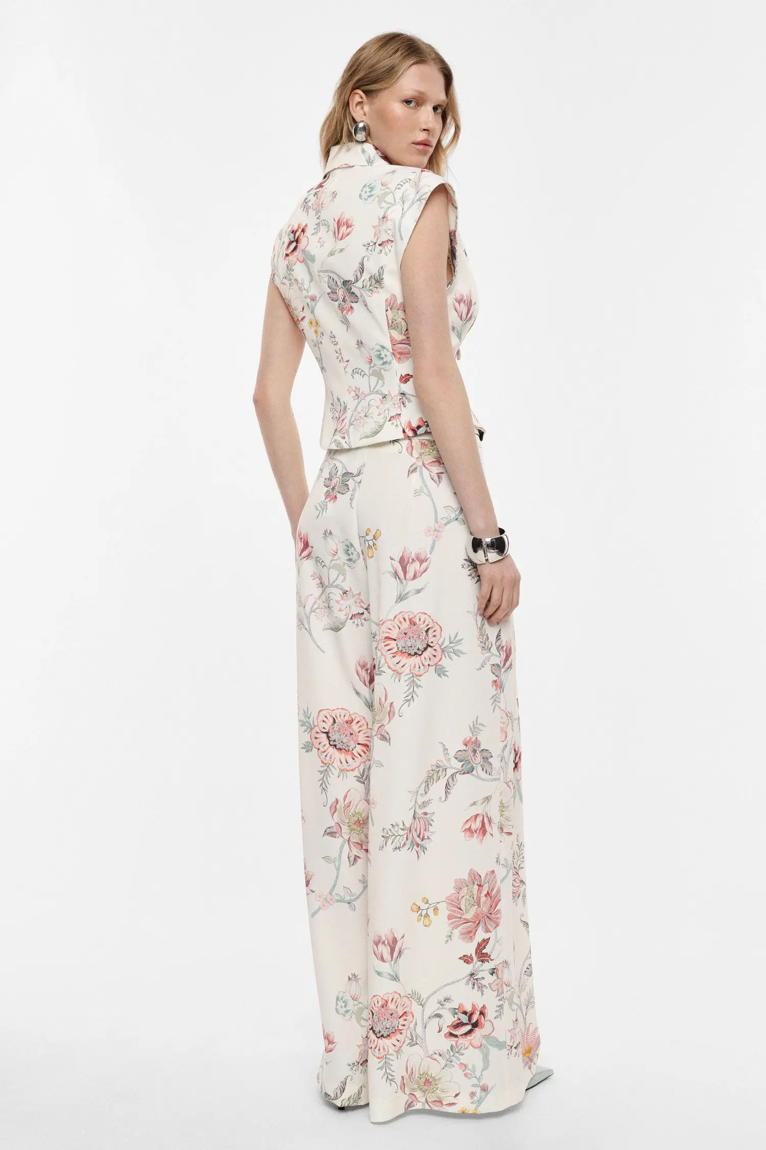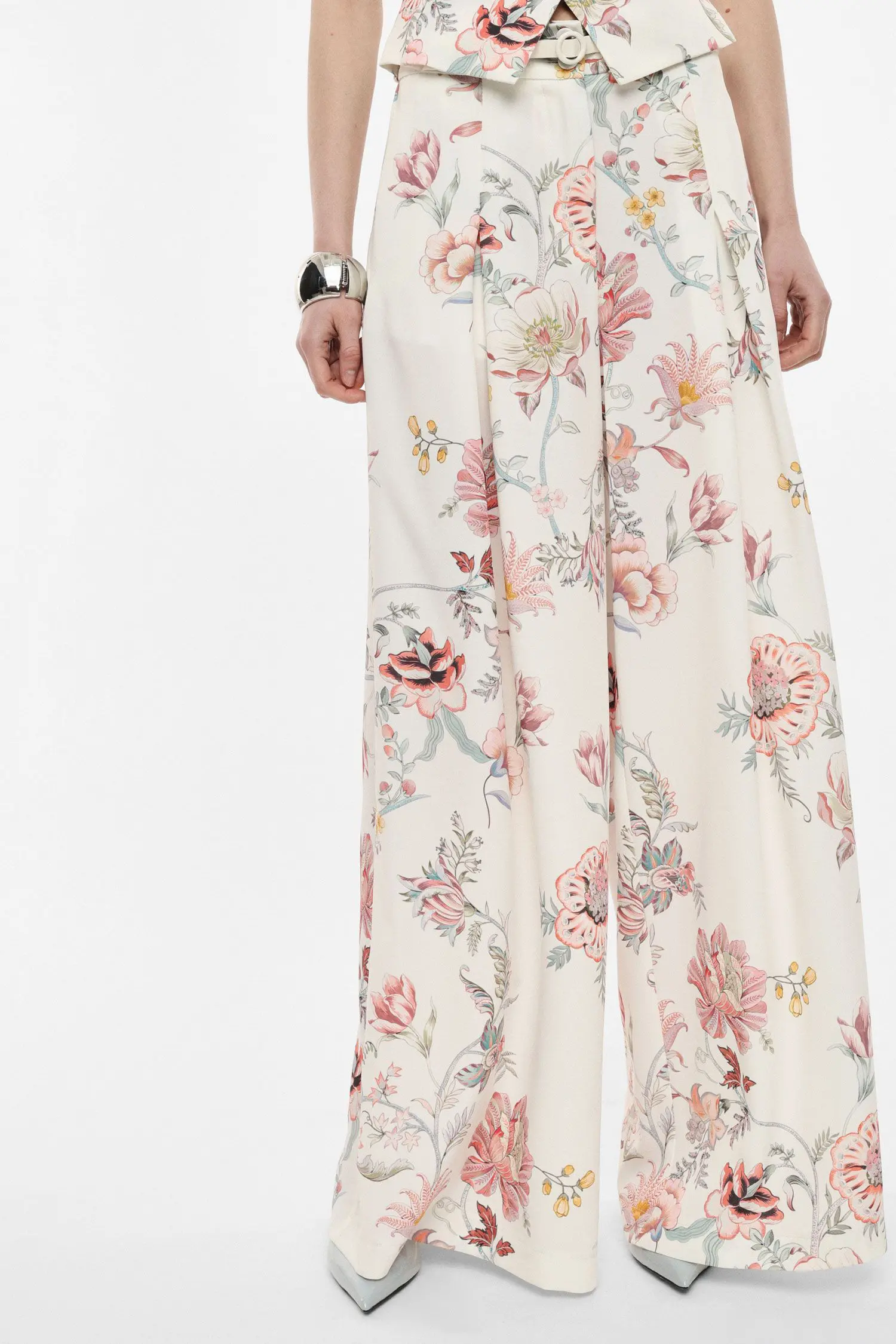 Visok pas, razkošno širok palazzo kroj in eleganten cvetlični potisk ustvarjajo hlače v katere se je enostavno zaljubiti. Ta model hlač dopolnjuje ujemajoč pas, ki lepo poudari pas in ustvari ženstveno silhueto. Nežni naborki dodajo pridih prefinjenosti ter poskrbijo za elegantno padajoč videz. Hlače so sestavljene iz materiala, ki je lahkoten, prijeten na otip in lepo pada, kar hlačam daje eleganten videz. Dodatek elastana pa poskrbi za rahlo raztegljivost, večje udobje in boljše prileganje postavi